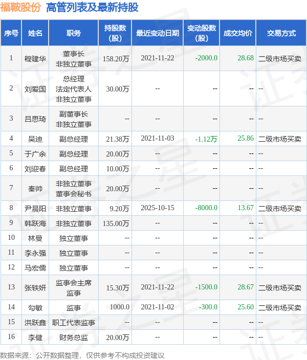 福鞍股份的高管列表及最新持股情况如下: